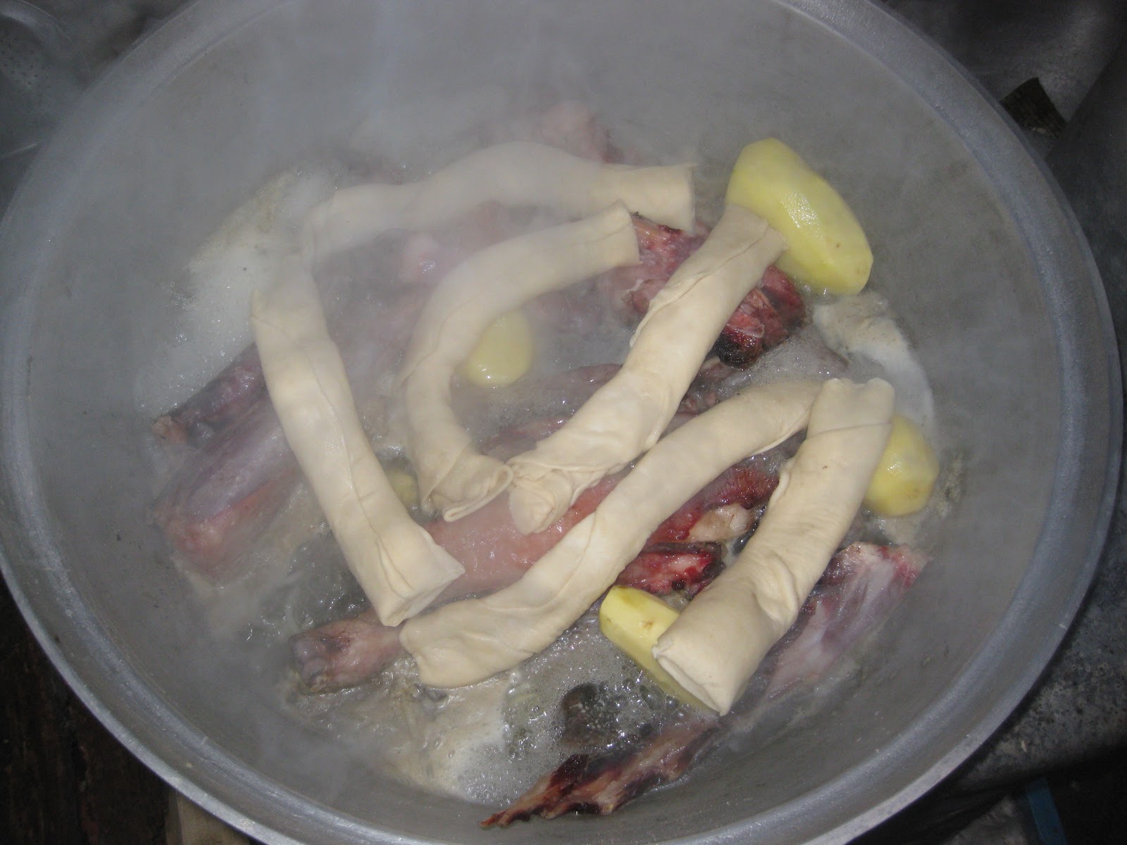 In the pot, there were the bones from the goat, with potatoes, and after the initial boil, hot rocks were added to continue the boiling.